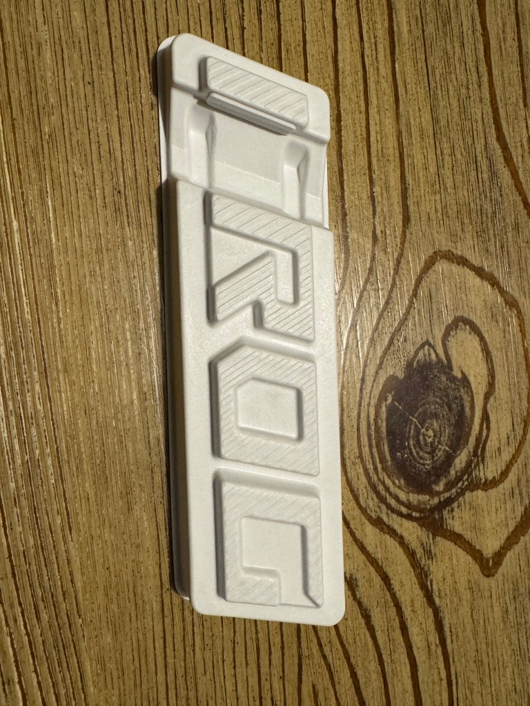 It’s light, seems plenty durable, packs away easily and is completely recyclable. It’s great not to see some cruddy piece of plastic and, in this case, the paper stand does the trick nicely. Everybody wins.