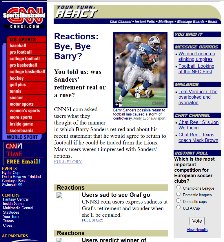 CNN/SI was a genuine multimedia venture, combining the writers of the magazine with a new website, cnnsi.com, and a television network called CNN/SI. I was an “interactive producer” for the site, which may be the most 1999 job title imaginable, which meant that I worked on user-interactive features. We had forums and user pieces where we’d ask readers their opinions and post some of the most trenchant responses later in the day. And we had live chat.